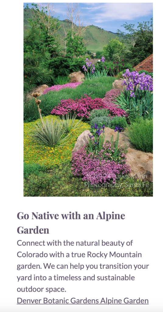 Sustainability is the future of gardening, and Colorado’s gardeners can lead the way. In-state studies show that replacing a lawn with beds of native plants or using xeriscape design can save 50% of a households water consumption, as well as increase property value by up to 15%. Xeriscape design and native plants provide year-round curb-appeal, attract essential pollinators like bees and butterflies. drastically reduce maintenance costs and requirements, the need for chemicals and fertilizer soil erosion.